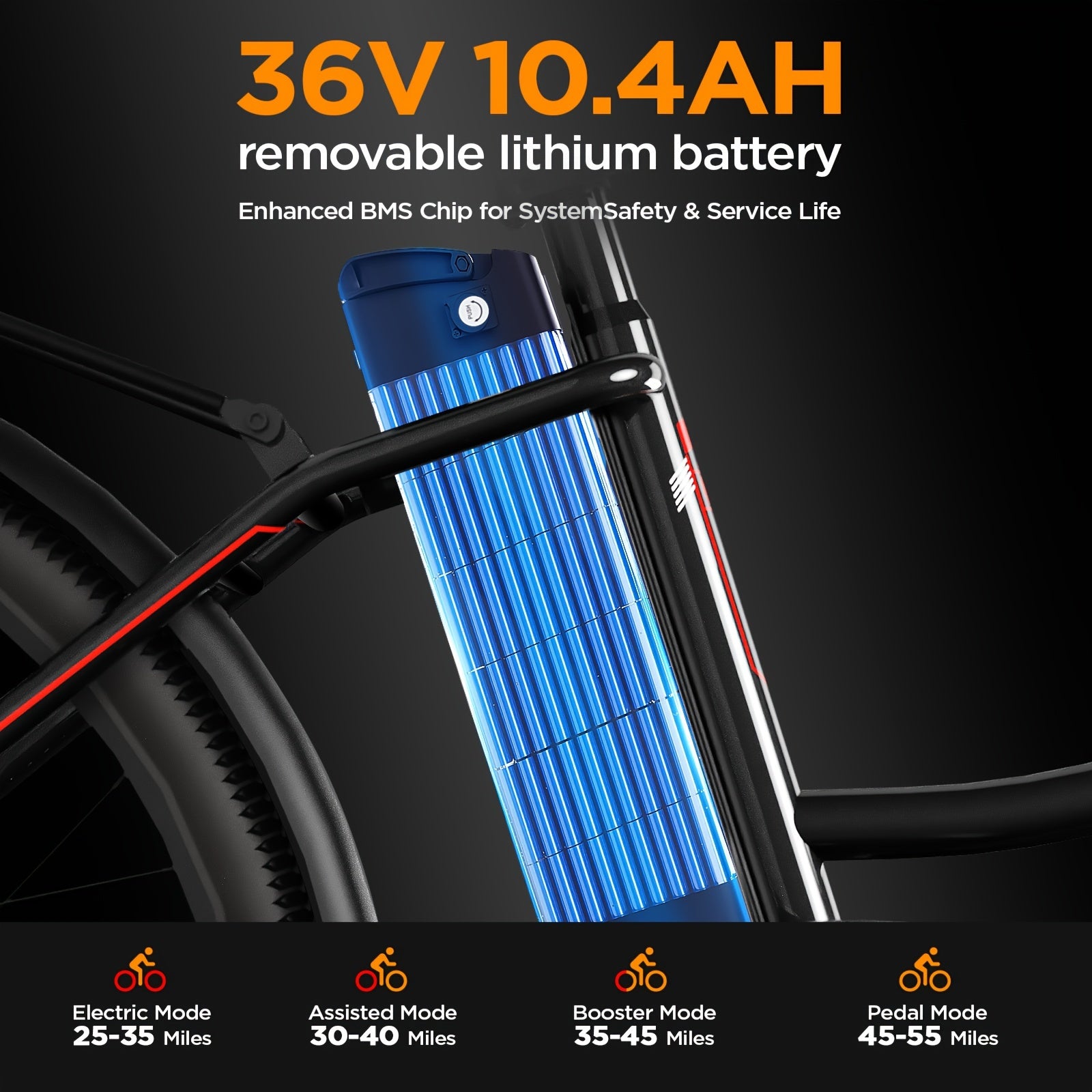 [36V Lithium-ion Battery]The Totem City Commuter electric bike is equipped with a 36V 468Wh lithium-ion battery with advanced overheating, overvoltage and overcharge Safeguard to ensure reliable performance and safe use. The 3A fast charger can charge the battery in 2-3 hours. It can travel up to 30 miles on a single charge