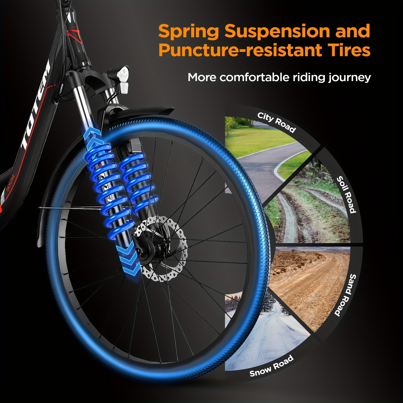 [Powerful Motor and Dual Disc Brakes]Totem adult electric bike is equipped with 350W rear Center motor. Maximum speed 20MPH Whether it is daily commuting or outdoor tour, this electric bike can provide sufficient power to meet your travel needs. Front and rear mechanical disc brakes provide excellent braking force for your riding, reducing braking distance and improving safety