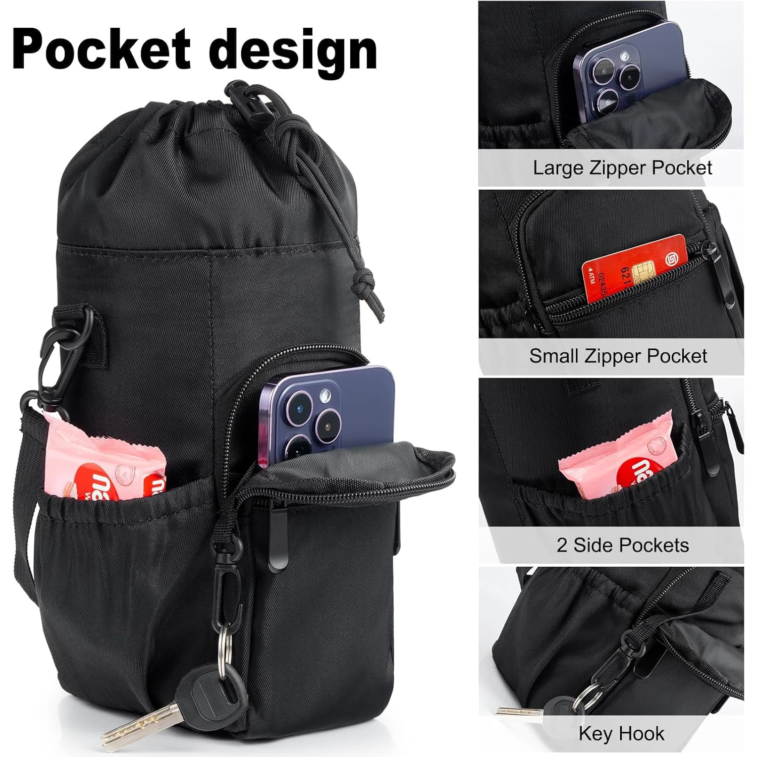 Mutiple Pockets for All Personal Items: Our water bottle carrier offers ample space for all your personal items. The main pocket features a convenient drawstring closure, making it easy to insert and remove your bottle. Meanwhile, two front zippered pockets with a key leash can hold your smartphone, keys, and other essentials, while two slip-in side pockets provide a handy spot for snacks.